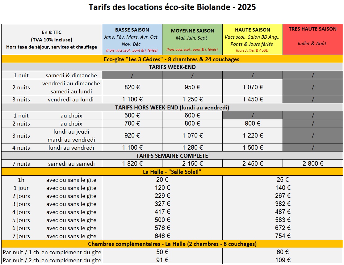 • La taxe de séjour, le chauffage (hiver) et les services complémentaires (ménage, matériel supp.) ne sont pas compris dans les tarifs présentés. Contactez-nous ou reportez-vous à la rubrique « Activités & Services ».
